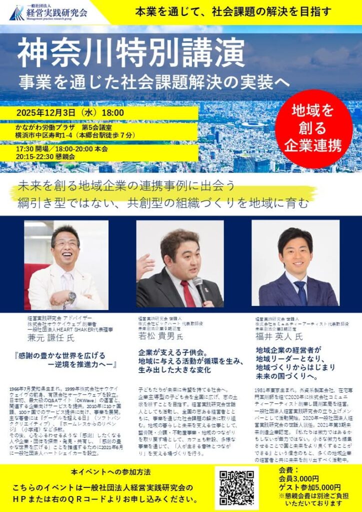 News 経営実践研究会(神奈川) Bykanemoto 2025年12月5日2025年12月5日 当一般財団法人の代表理事が経営実践研究会(神奈川)のイベント「事業を通じた社会課題解決の実装へ」の特別講演で「感謝経済」について講演させていただきました。